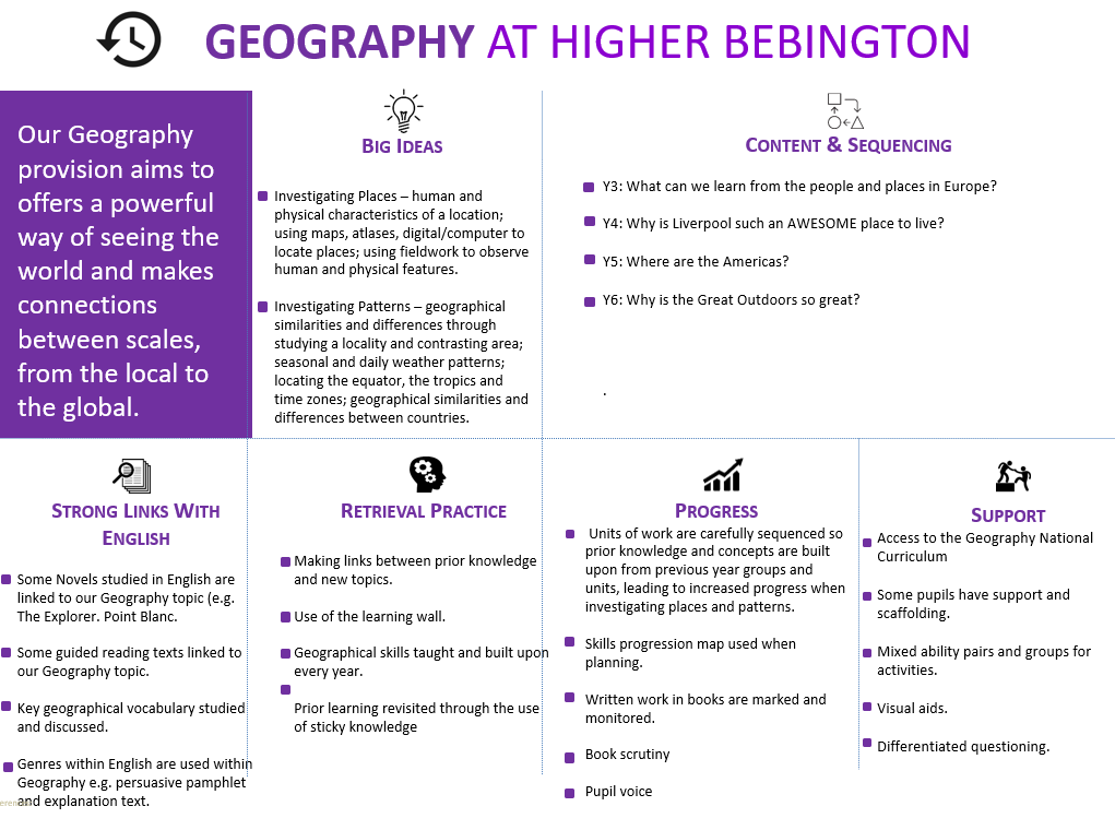 Children’s geographical learning starts with the familiar and slowly builds outwards, from Merseyside, to the UK, to Europe, the Americas and Africa. Their understanding of how their local area fits into the wider world is therefore gradually accrued. More in-depth studies allow children to develop their understanding of the interactions between physical and human geography, with units on Europe in Year 3, Liverpool in Year 4, the Americas including the rainforest in Year 5 and mountains, rivers and coasts in Year 6.